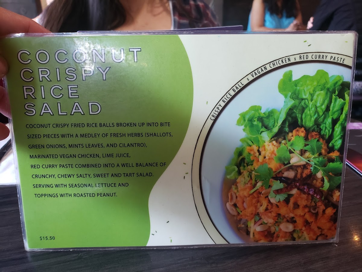 Coconut crispy fried rice balls broken up into bite sized pieces with a medley of fresh herbs(Shallots, green onions,mint leaves, and cilantro), marinated vegan Soy chicken, lime juice, red curry paste combined into a well balance of crunchy, chewy salty, sweet and tart salad. Serving with seasonal lettuce and toppings with roasted peanut.